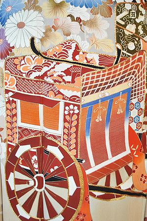 帆の部分には七宝繋ぎ、蓑笠、宝絵巻など吉祥文が配され、全体に手刺繍が施された非常に豪華な仕立て。