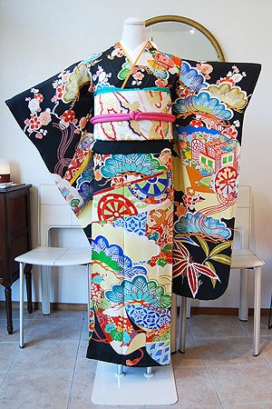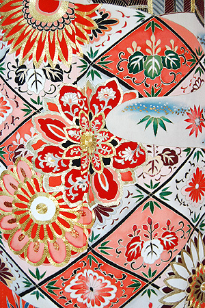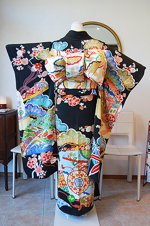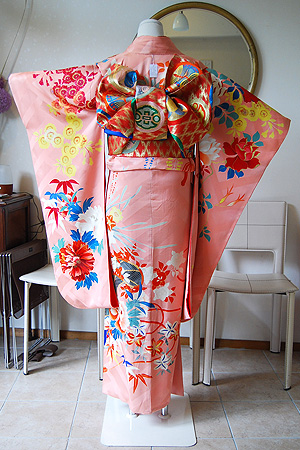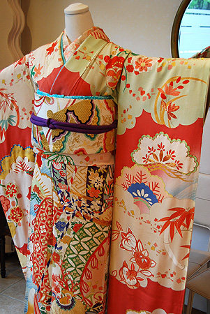 写真では見えにくいのですが、金糸、銀糸を使った刺繍もふんだんに施され、非常に手の込んだ豪華な一着。