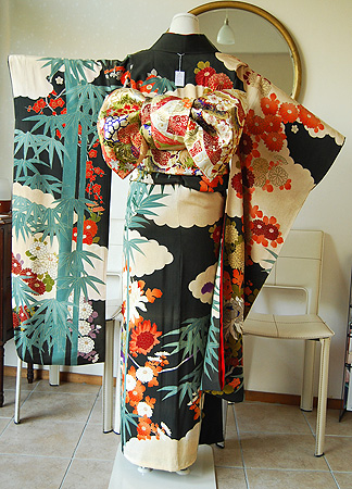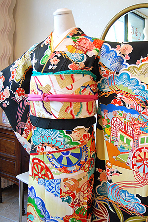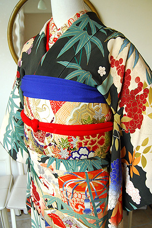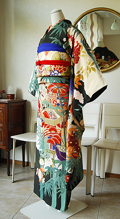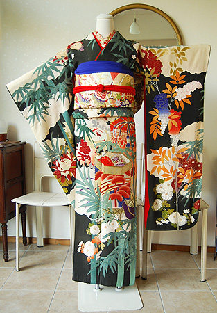 桜に橘、梅、菊、松が所狭しと描かれ、上前から袖に掛けて絞り文様で御簾がデザインされた創造性豊かな意匠。