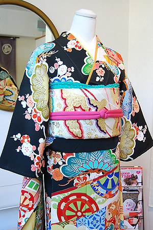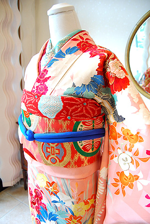 写真では水色の帯を合わせていますが、このように同系色の帯を合わせると振袖の色味が引き立ちよく合います。