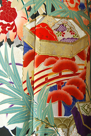 すっと上に向かって伸びる竹、こぼれんばかりにたくさんの実を付けた南天、吉祥文とされる菊、婚礼道具である貝桶など、沢山の意味のある図案が用いられた豪華な図案です。