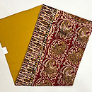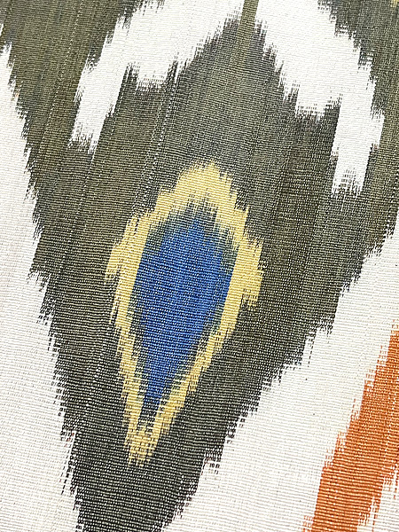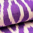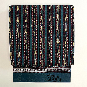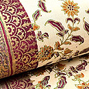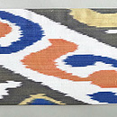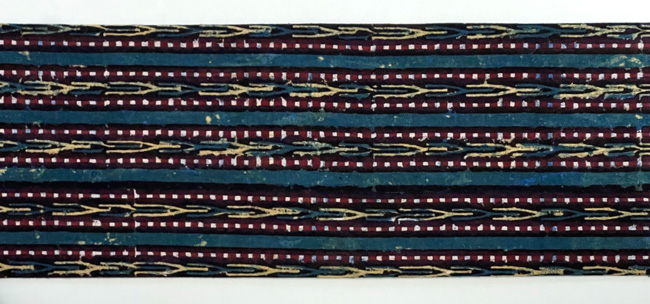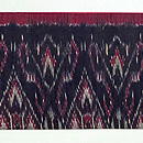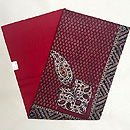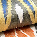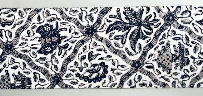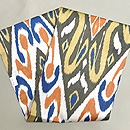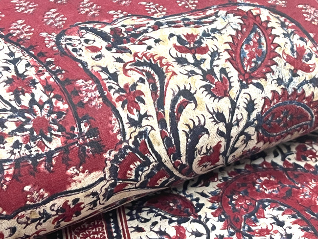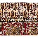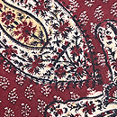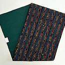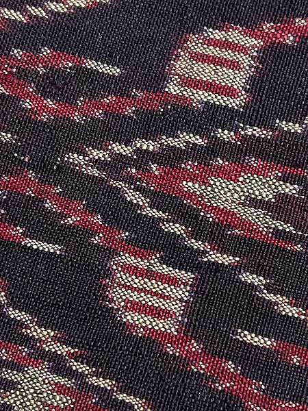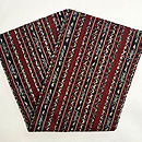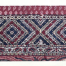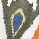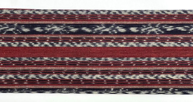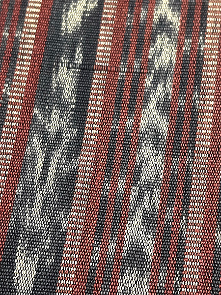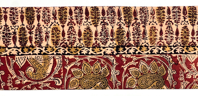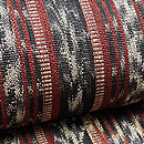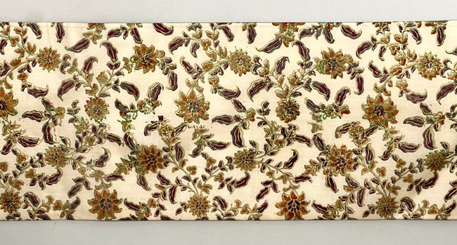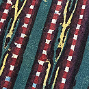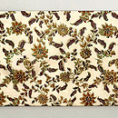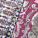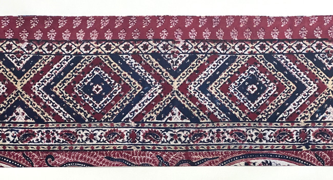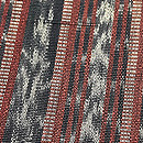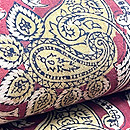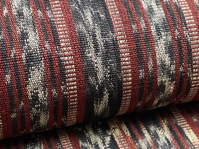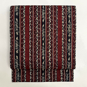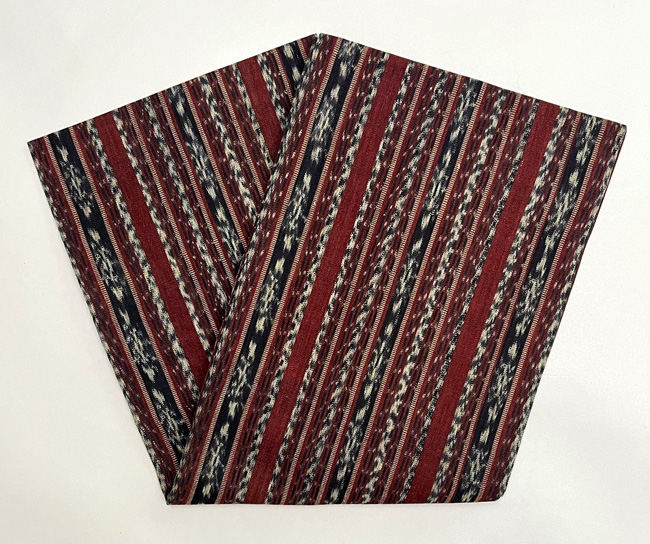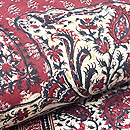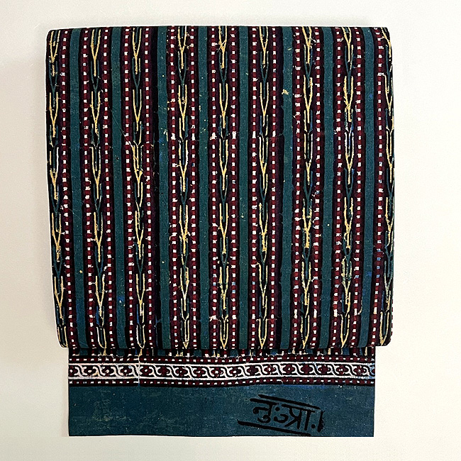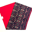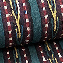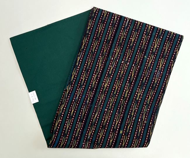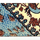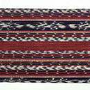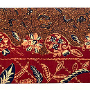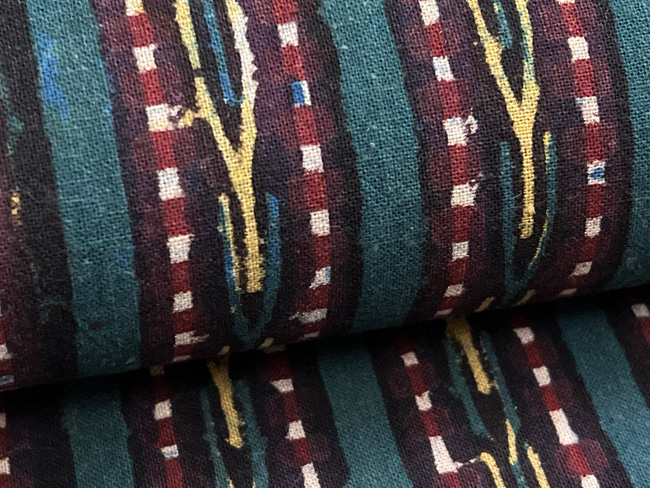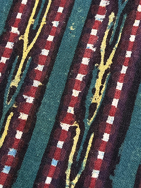 臙脂・緑・黄土色の縞に、やさしい草花、勾玉などを型染めしたインドネシアの更紗。