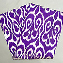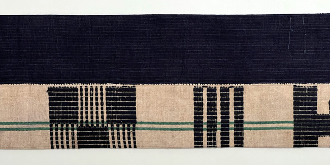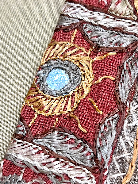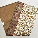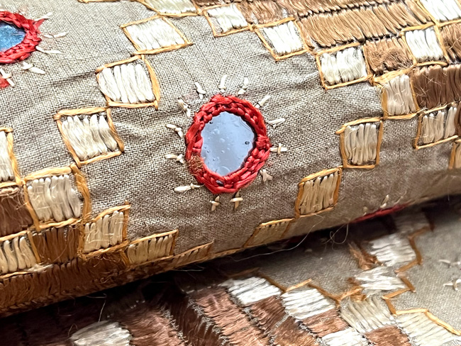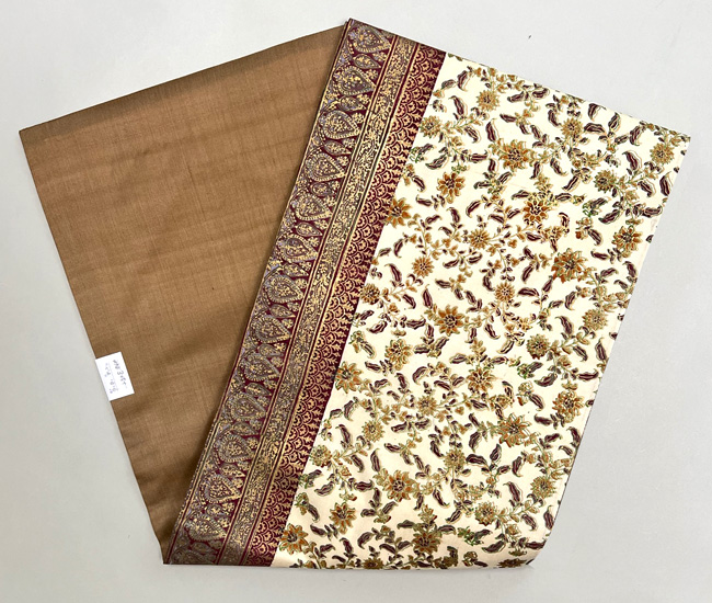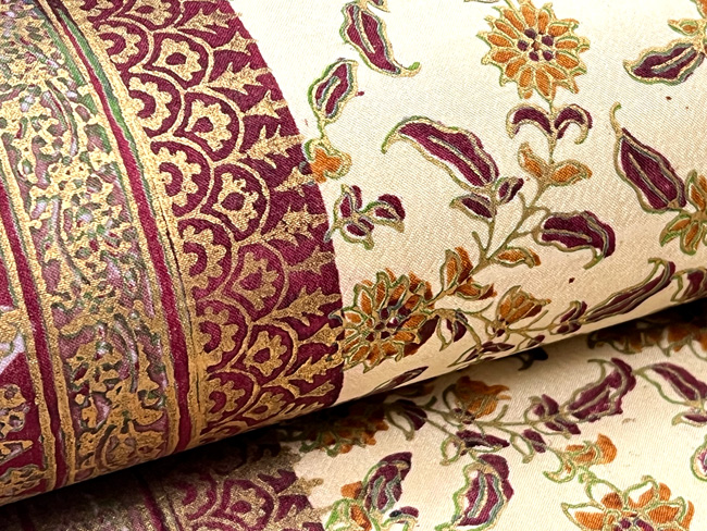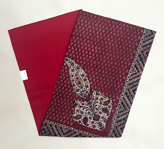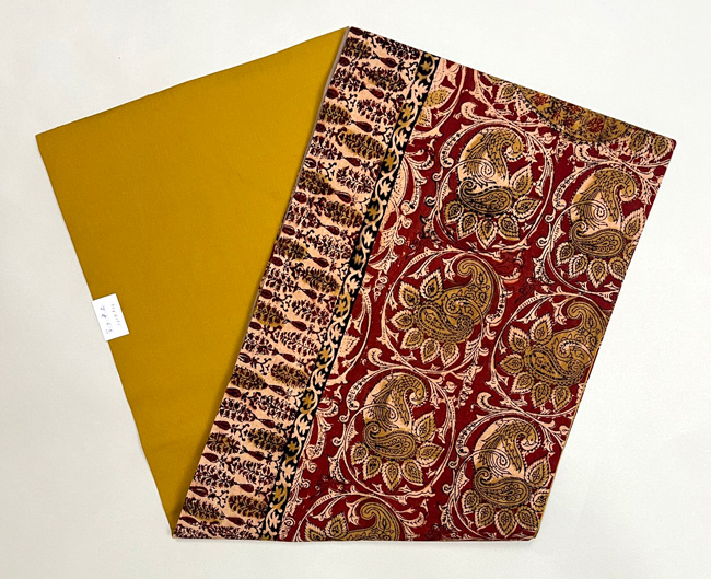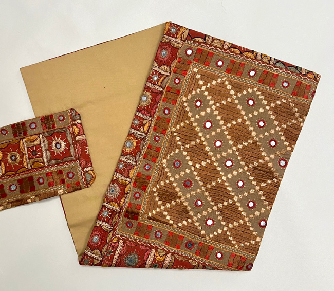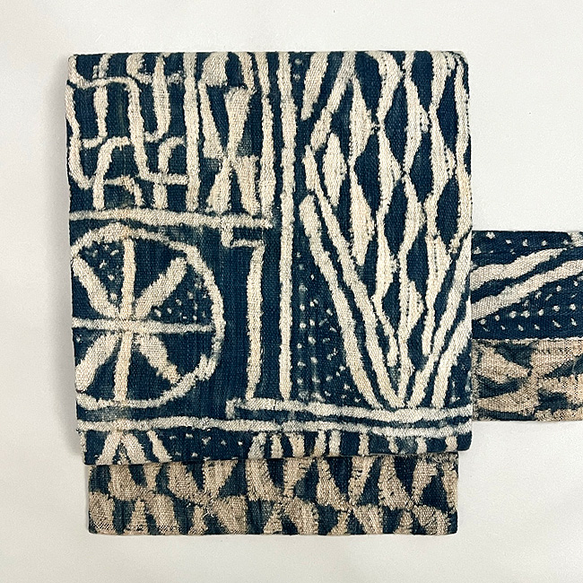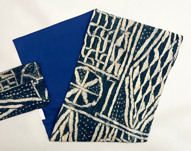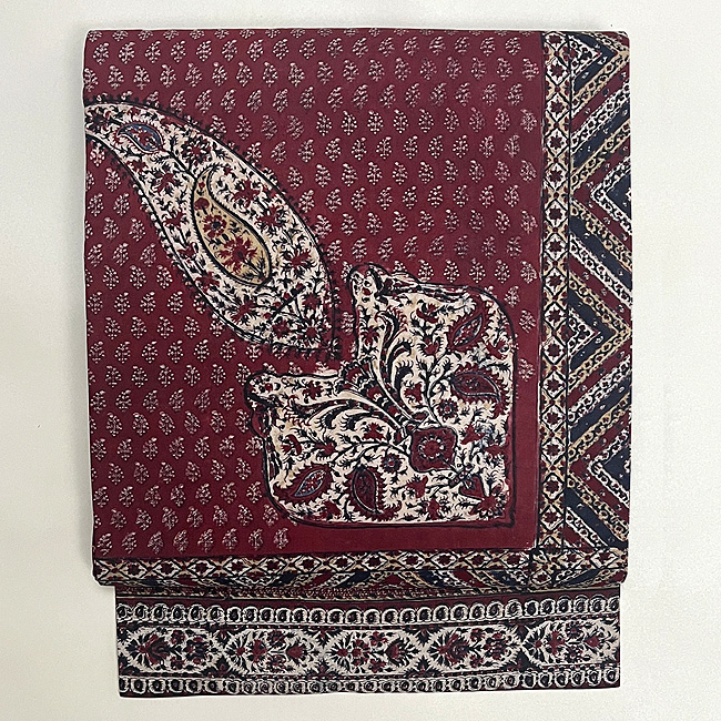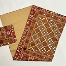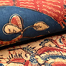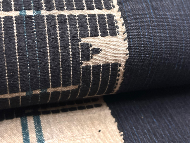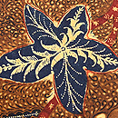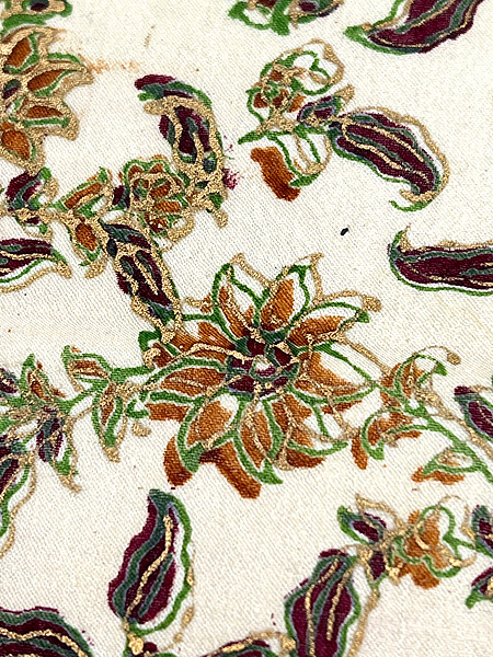 ブロックプリントで抽象画のように染め分けたその上に地色と合わせたカンタワークを施しています。