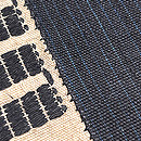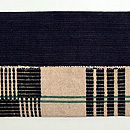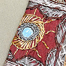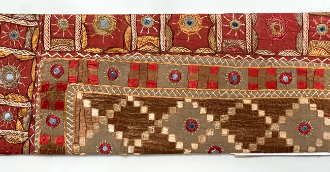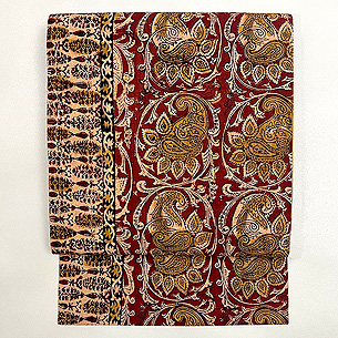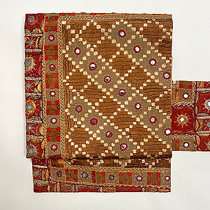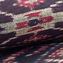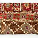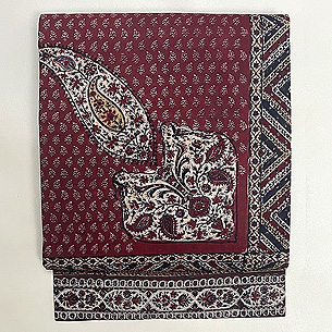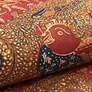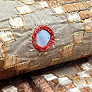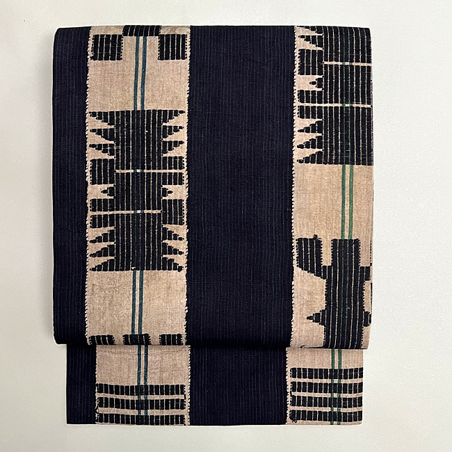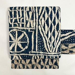 パッチワークのように大小の四角いスペースをブロックプリントで染め上げて、その上を様々な色でカンタワークした帯。