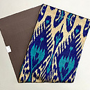 濃い藍と煙草色のなかに南国風の花や葉を大きく個性的に描いたインドネシアのロウケツ染。