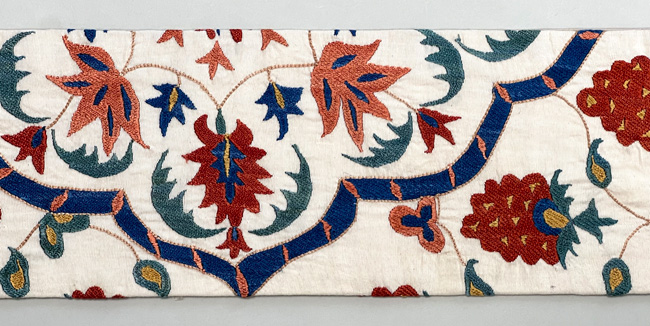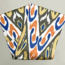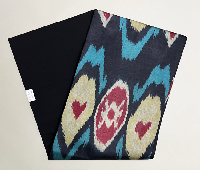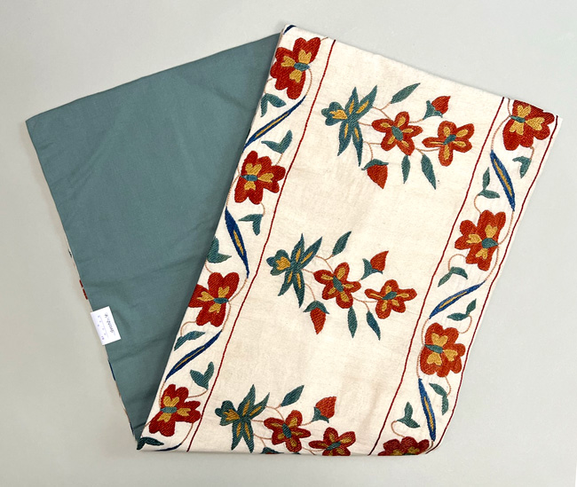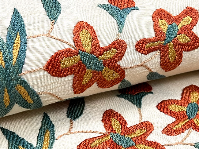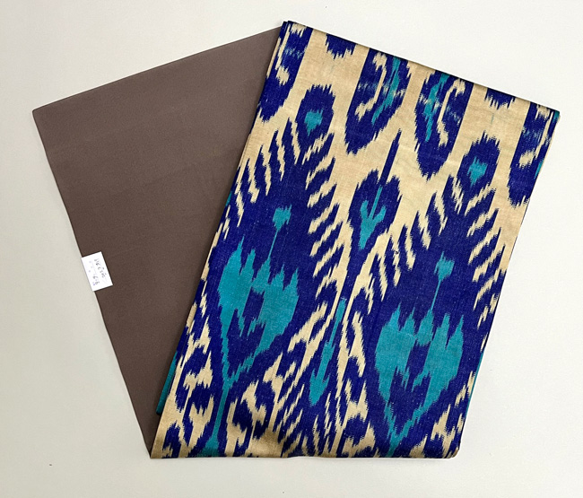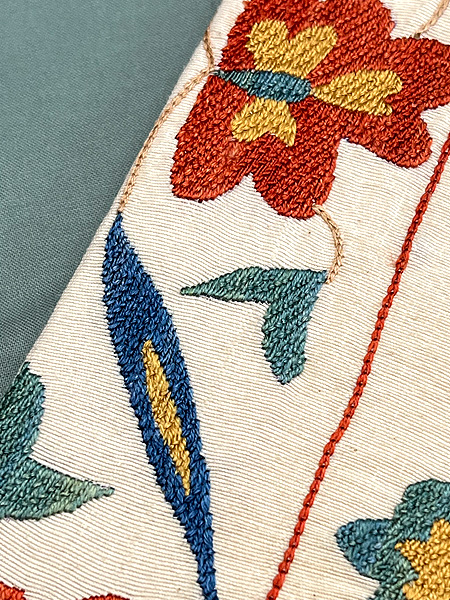 ブロックプリントで抽象画のように染め分けたその上に地色と合わせたカンタワークを施しています。