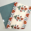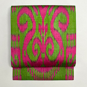 小花の連続文様の中にピンクやオレンジの花文様を染め出したバティックの名古屋帯は、ビリジアングリーンにパッと映える花柄が個性的です。