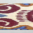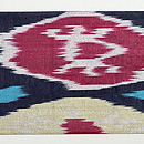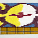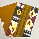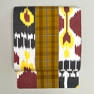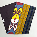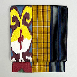 パッチワークのように大小の四角いスペースをブロックプリントで染め上げて、その上を様々な色でカンタワークした帯。