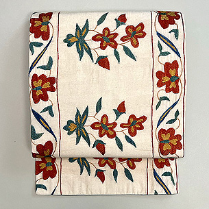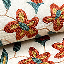 白地に赤と焦茶でシンプルに小花と葉を染めた名古屋帯。
