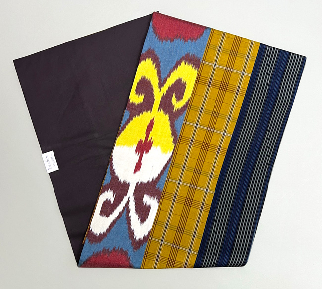 その木綿に伝統的な図柄を泥染めした布を名古屋帯に仕立てました。