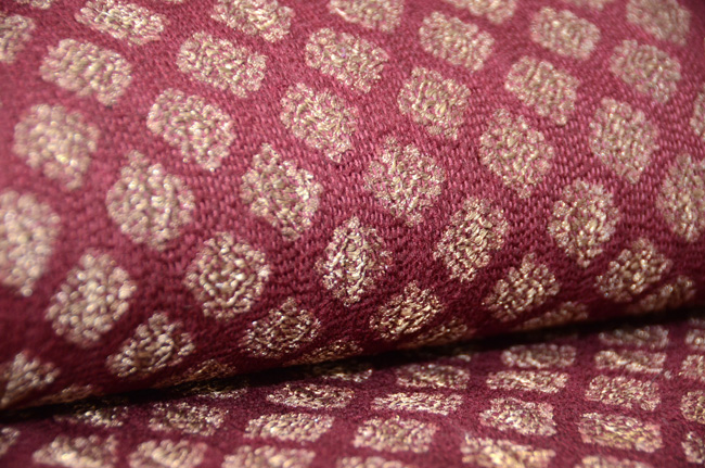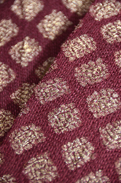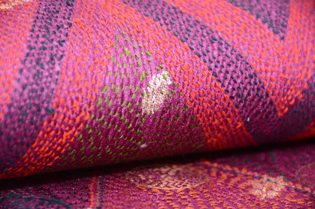 緯浮織で金銀糸を織り込んで、さらにその上から縦に細かくステッチをして、布に縮を作るという細かい技を使っています。