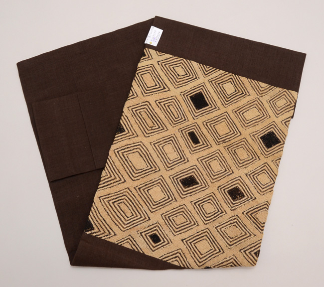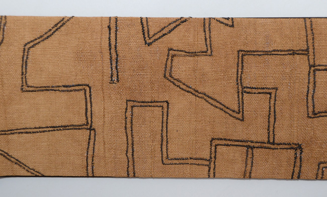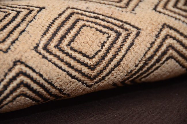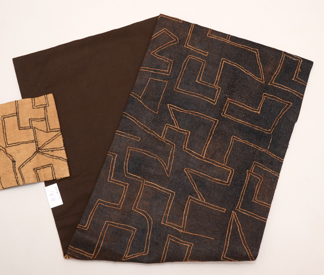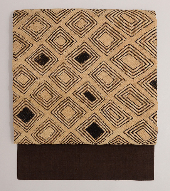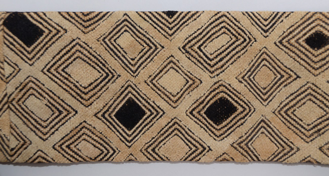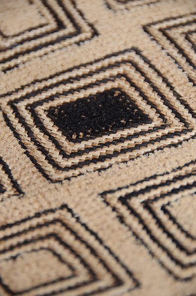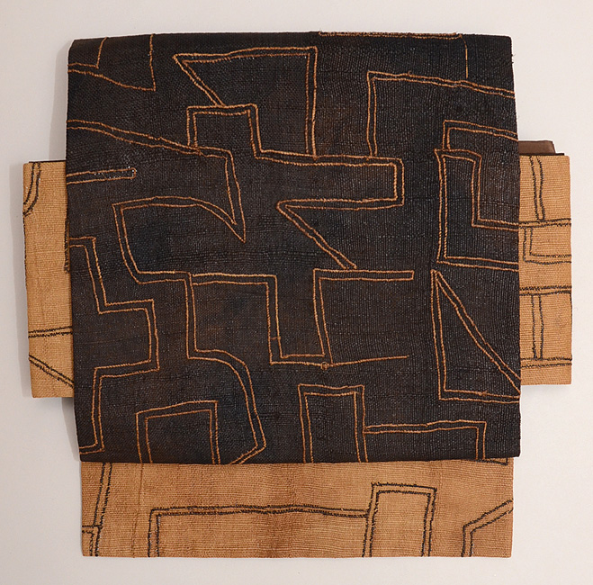 ラフィアの布に穴を開け、ステッチを施して幾何学文様にした大きな布を、アフリカクバの人たちは腰布としてつかっていました。