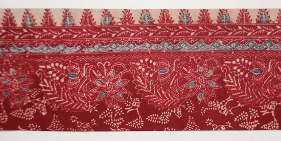 大きなペーズリーとボーダー、唐花文様とが、典型的なインド更紗です。