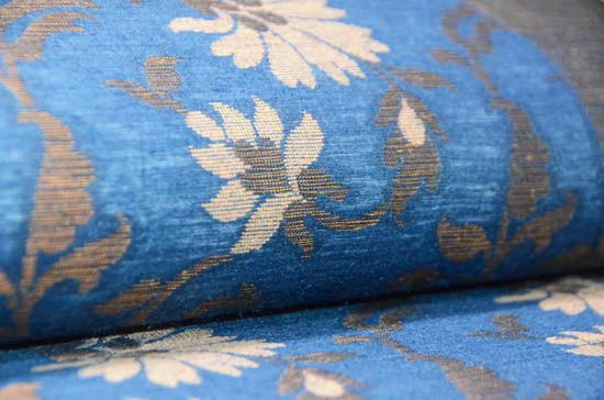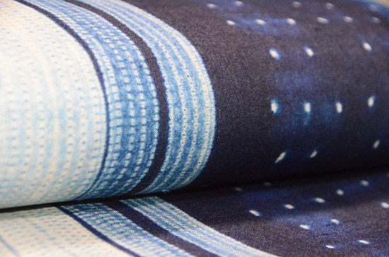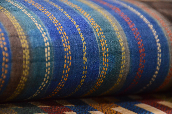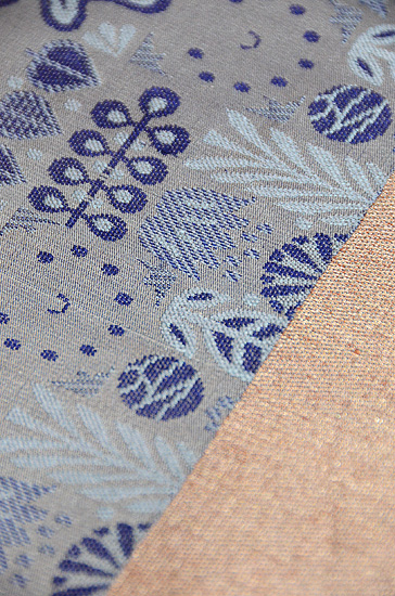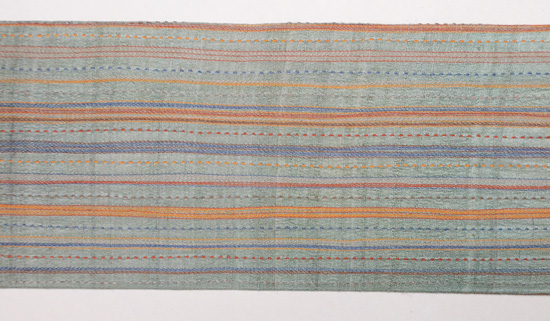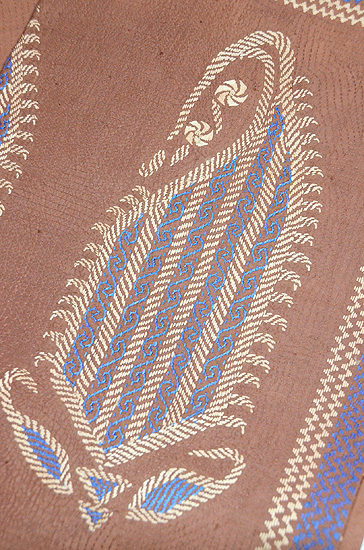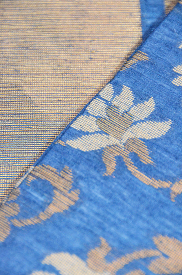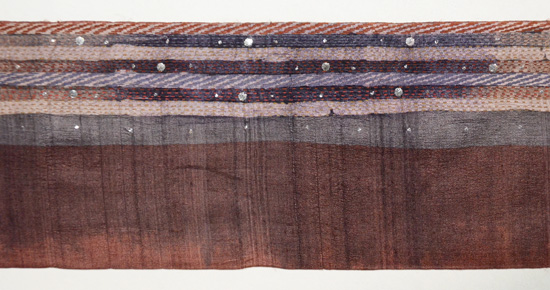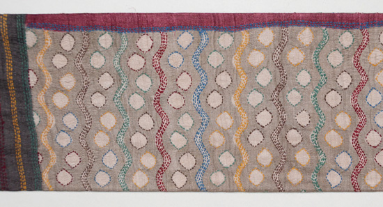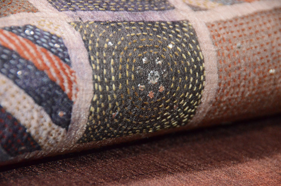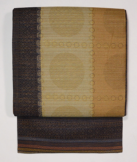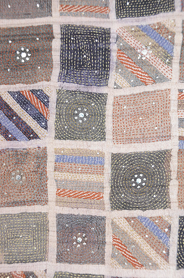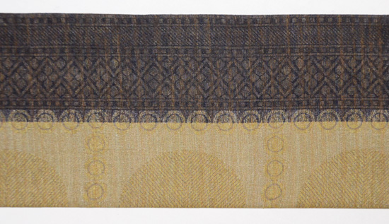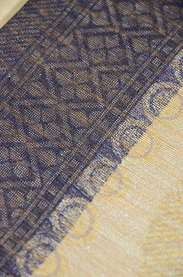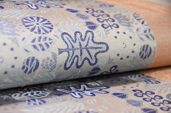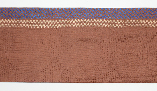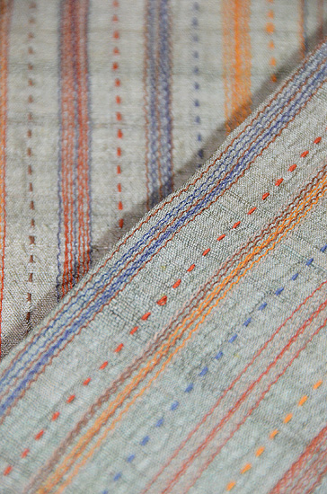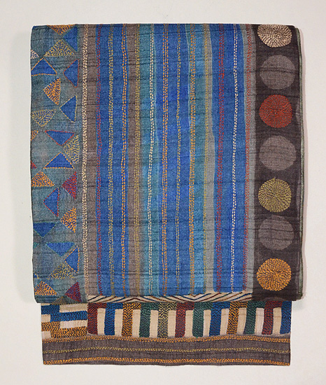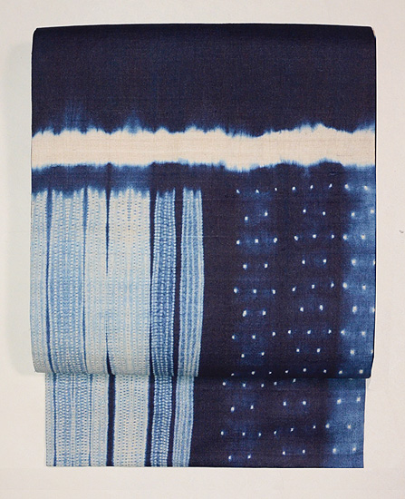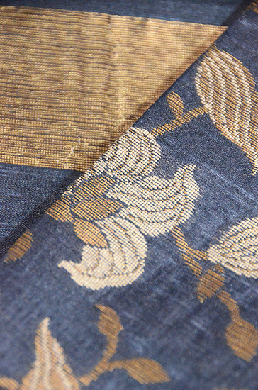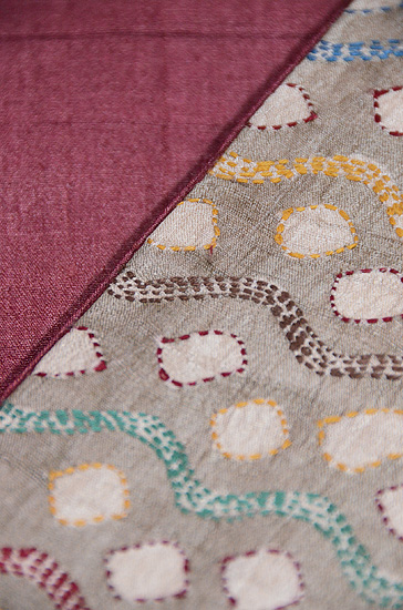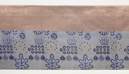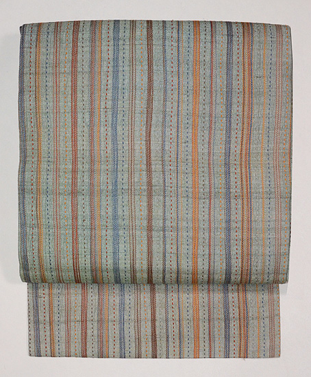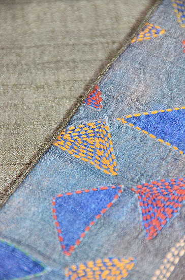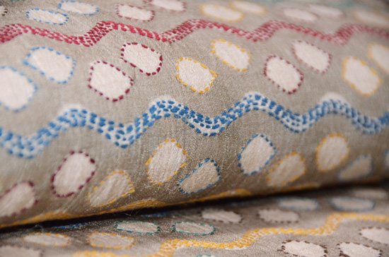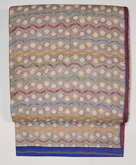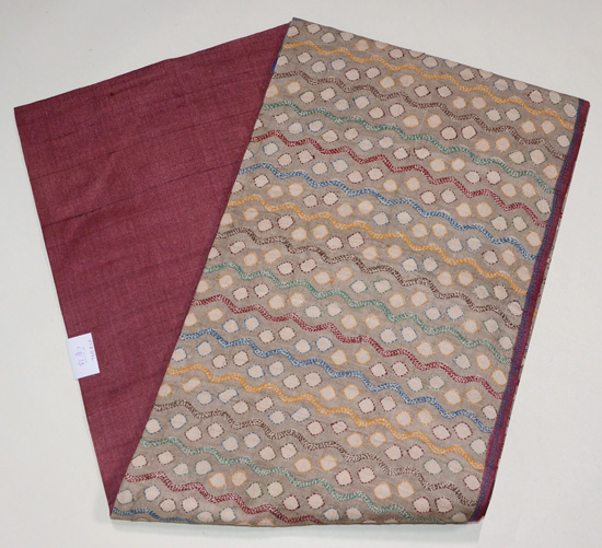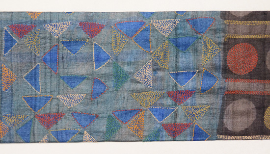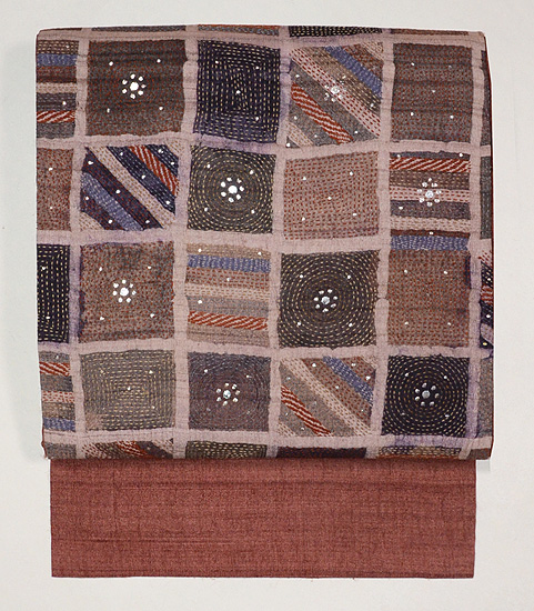 コラージュされた、それぞれの布の色目が違い、少し素朴な針目にあいきょうがある、そんな楽しい帯になりました。