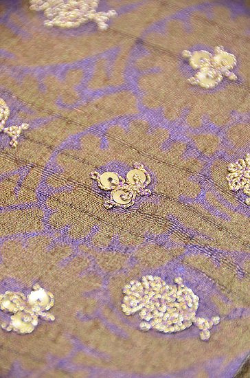 唐草模様がブロックプリントされた上に、ミラーワークでお花の柄が刺繍されています。