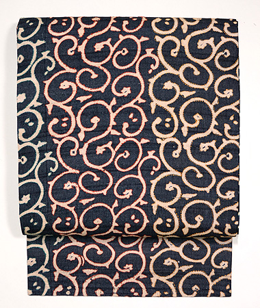 鬼手と言われるざっくりとした木綿地に、媒染染めの茜色が美しい帯です。 酸性とアルカリ性の媒染液によって、茜染めが魔法のように色々な色を発色させて、しかも、堅牢度も100%に近いと言われるインド更紗は、まさしく染めの王者と言われています。 希少性も増しています。この機会にいかがですか。