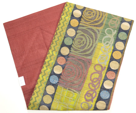 黒地にグリーン、ブルー、赤茶、イエローオーカー、トパーズと6色のカンタワークが、されているサリーを名古屋帯にお仕立てしました。