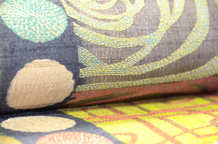 これまでご紹介しましたカンタワークもそれぞれ時間と手間をかけて作られた物でしたが、このカンタは、多色の引き染めの上に8色もの糸が、配色されたハードワークのカンタです。