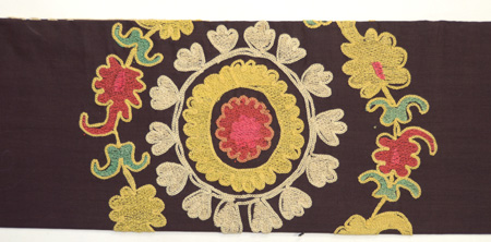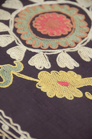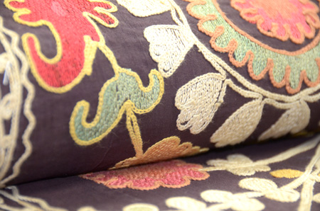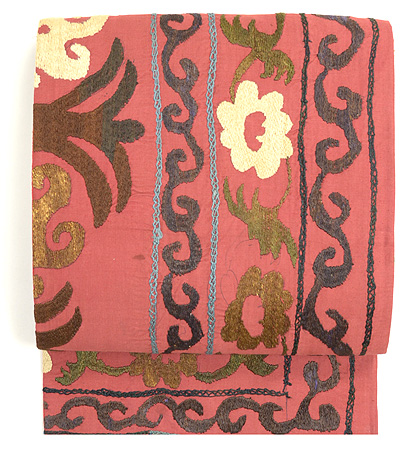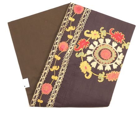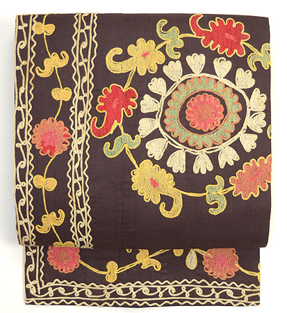 チョコレート色の地にやさしく明るい配色で刺されたスザニが、なんとも大人可愛いいおしゃれな帯。