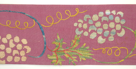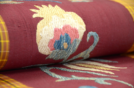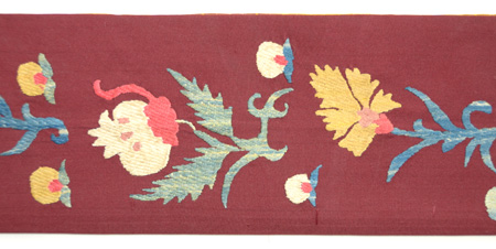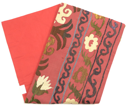 昔のしなやかな絹糸で織られた臙脂色の地に刺繍がなされています。