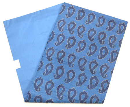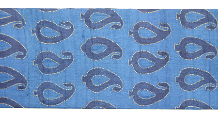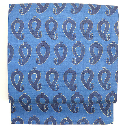 縹色(藍染めのあさぎと藍の中間くらいの濃さの色、強い藍)に濃紺のペイズリーが染められ、生成り色で細かくカンタワークされたシンプルで可愛いカンタワークの名古屋帯です。