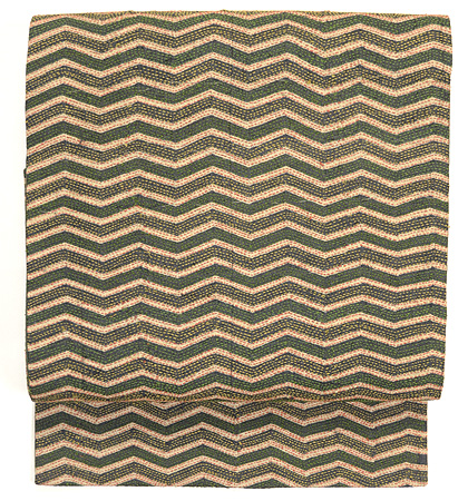 モスグリーンと生成りに染められた山並みにレンガ、緑、薄いマスタードの色でカンタワークされた名古屋帯です。
