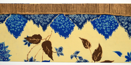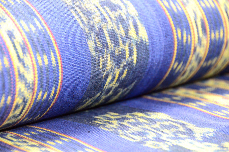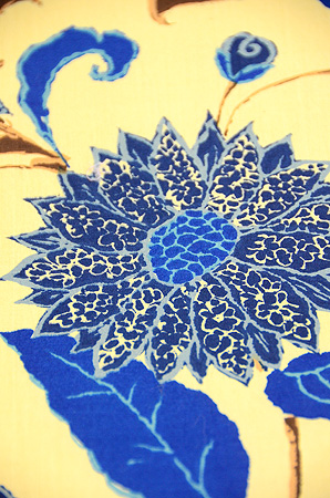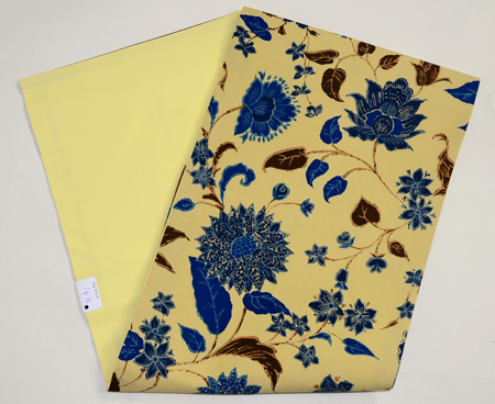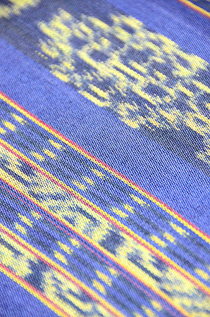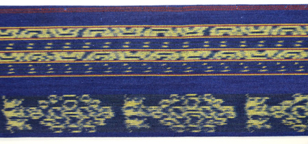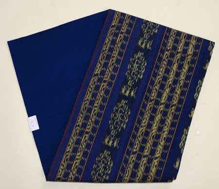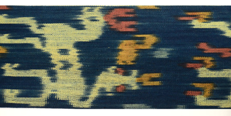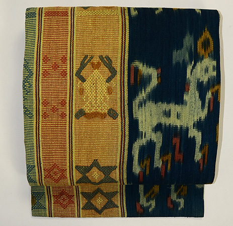 青藍(せいらん・鮮やかな青色)に赤茶と香色(柔らかい黄色)でインドネシアの絣(イカット)が織られた名古屋帯です。
