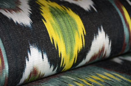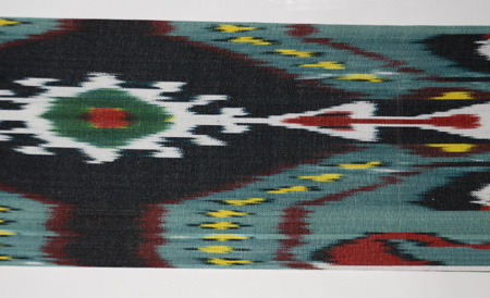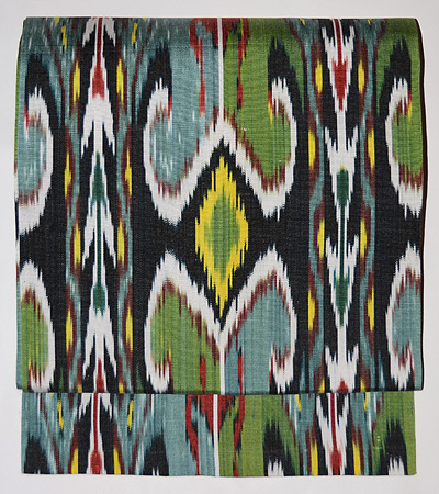 中央アジアウズベキスタンの経絣アドラスとよばれる布を名古屋帯にお仕立てしました。