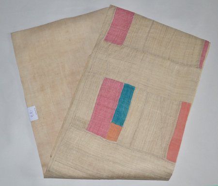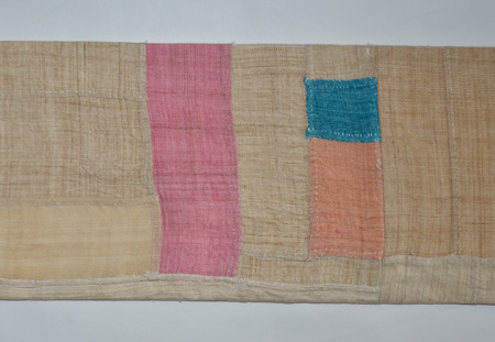 苧麻(からむし)と大麻(所々黒く見える部分は葛が織り込まれています)の布をパッチワークしてつくられるポシャギですが、その理由としては洋服の残り布を用いて作られていたことに由縁しているそうで、使い込むほどに味わいを増します。