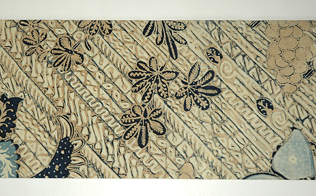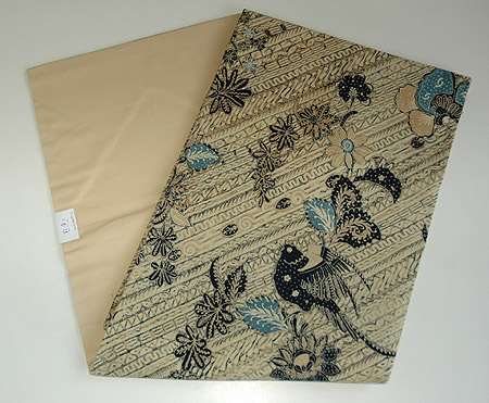 斜線文に花鳥唐草の細かな文様が、ロウケツ染めとは驚きます。