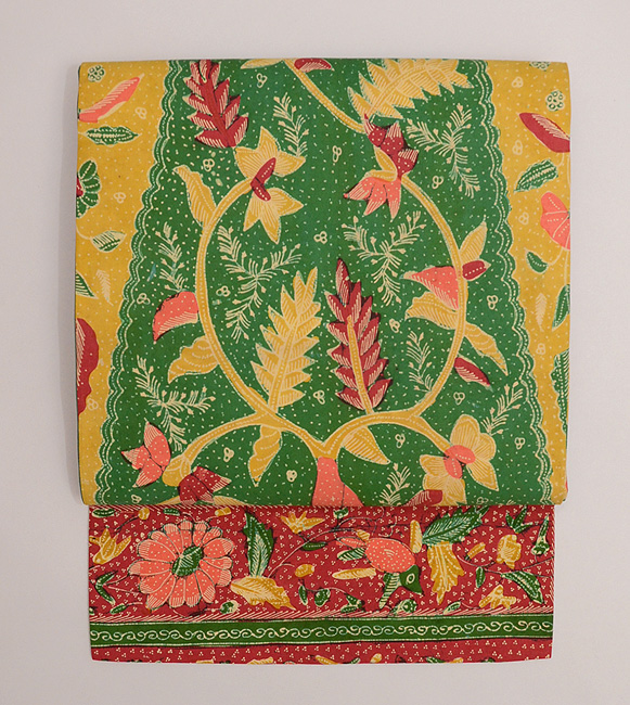 バティックは、どこを切り取るかでいつも悩みますが、かわいい垂れと、お太鼓にシャープなラインを持ってきましたがいかがでしょうか。