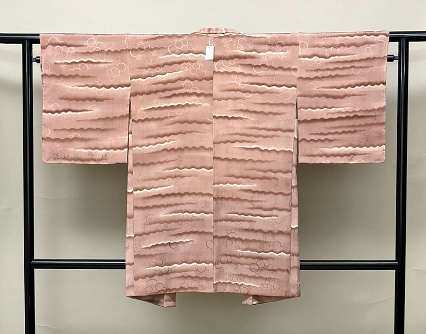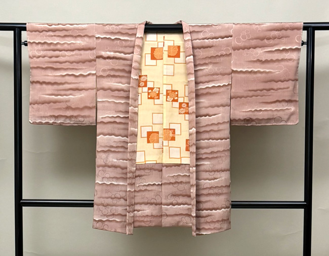 落ち着いたやわらかなピンクのお色目に、小豆色と白の横段の雲、万寿菊が一面に織り込まれたとても品の良い、合わせやすいお羽織です。