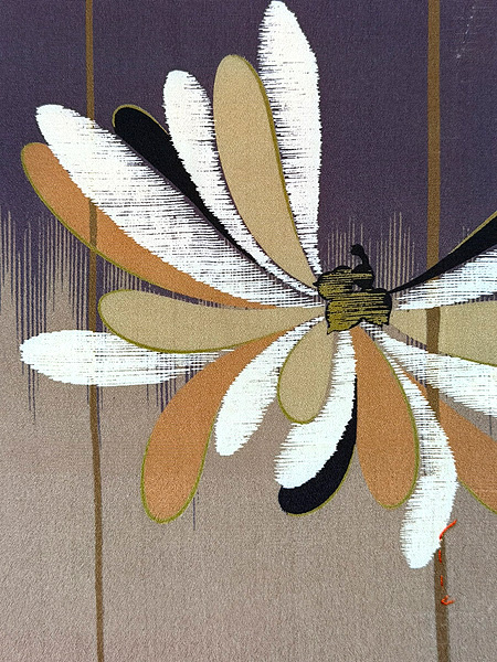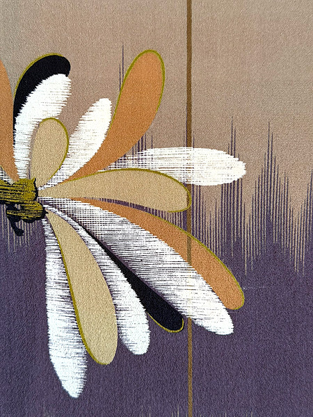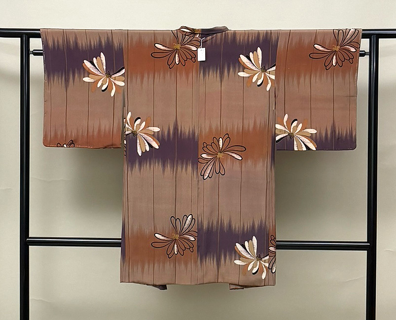 地の染め色も日本の中間色の心憎い組み合わせ、すこし抽象化された菊もモダン、昔の良い羽織に触れるのは目も手も喜びです。