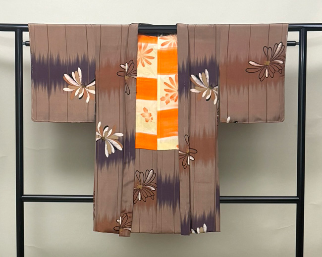 茶鼠に濃紫、團十郎茶の地に、大きな菊を染めた羽織