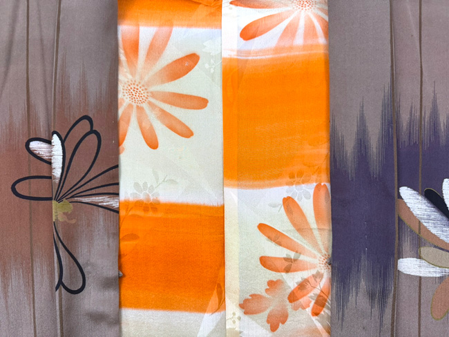 白い線で表現された菊とベージュ色の紅葉がベースにあり、その上に所々、散りばめられた紅葉の黒と緑、そして菊の中心のオレンジがアクセントになって全体を引き締めています。