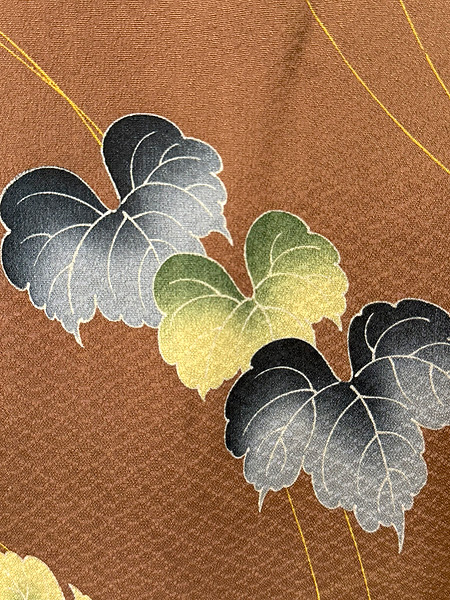 鳩羽鼠と言われるエビ茶のような大人っぽい色味にかわいい唐草の入った錦紗です。