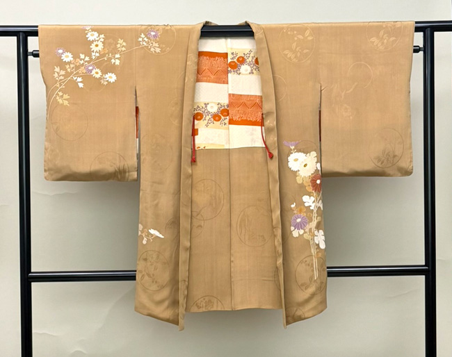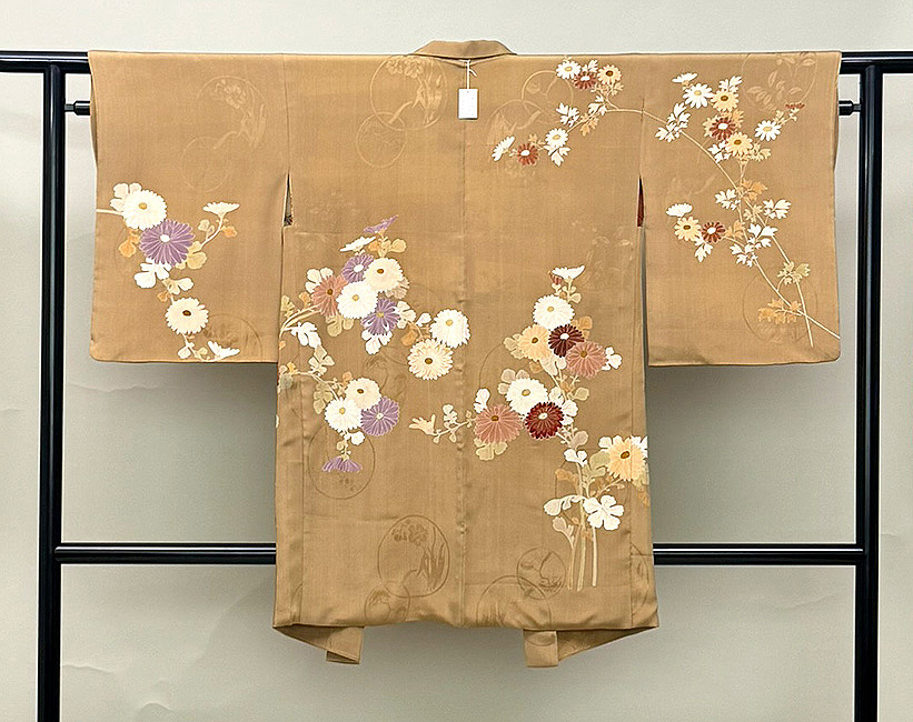そほ色の地に、菊と紅葉が全体に重なり合うようにデザインされたモダンな柄行の羽織です。