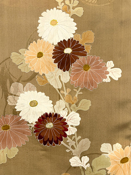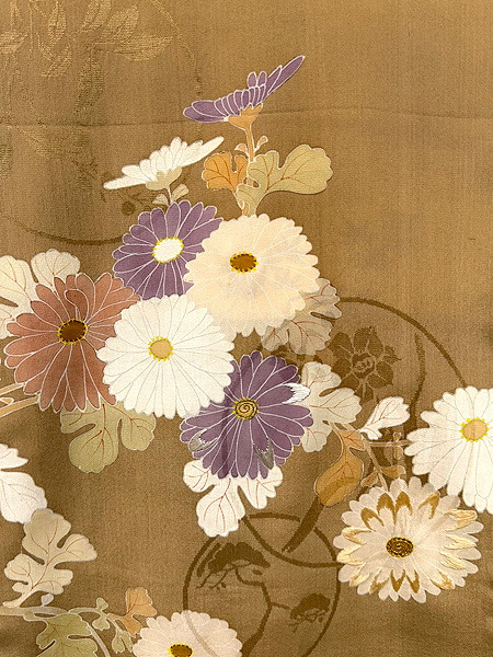 背中の菊の花芯や花びらはところどころに刺繍が施してあり、光を受けて上品に輝きます。