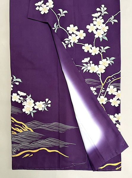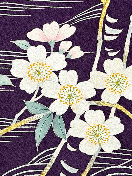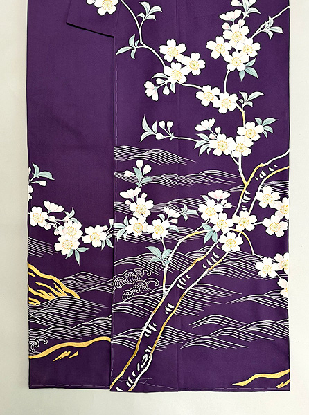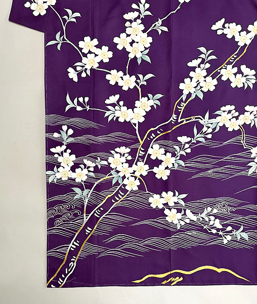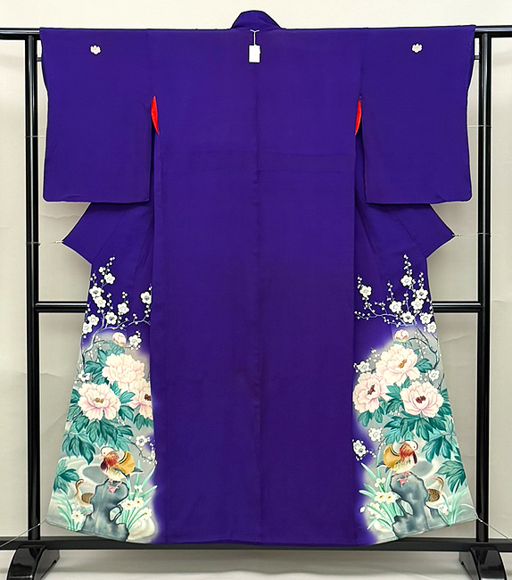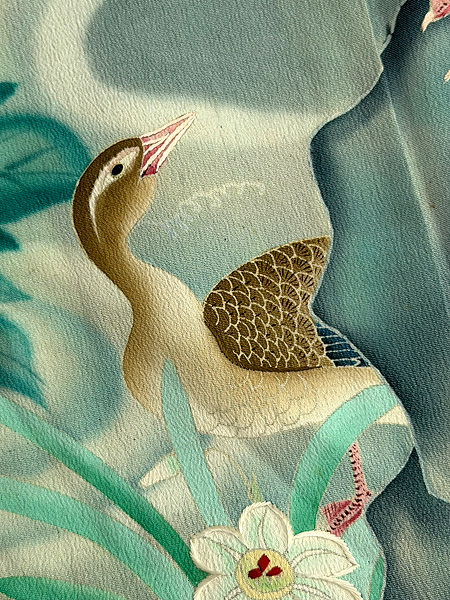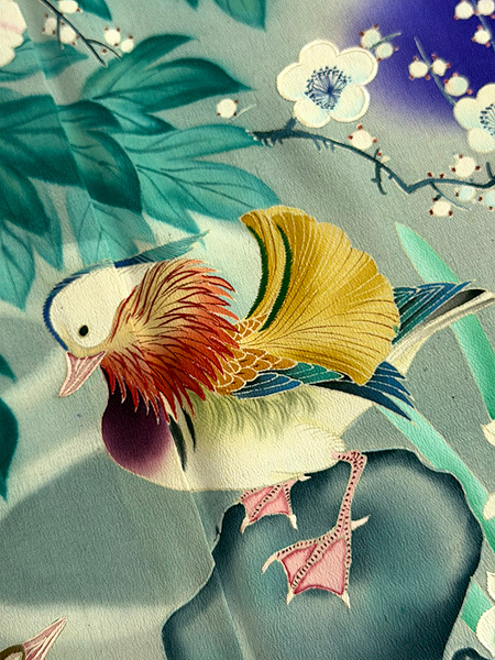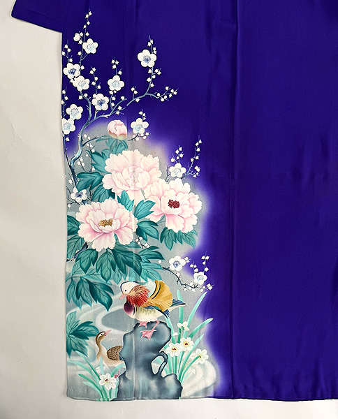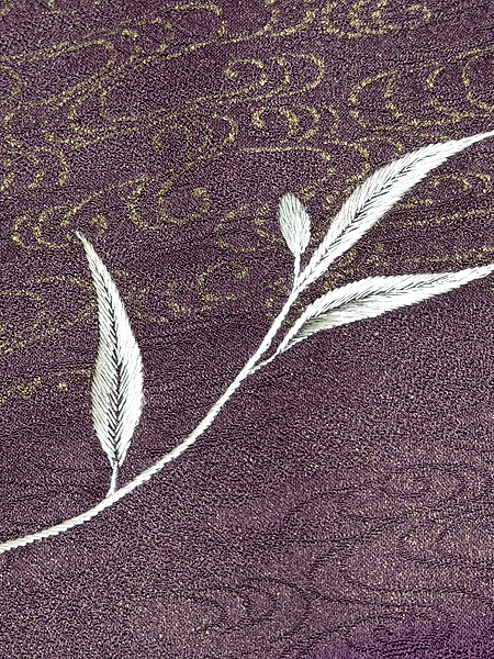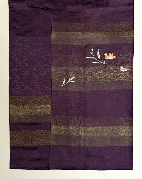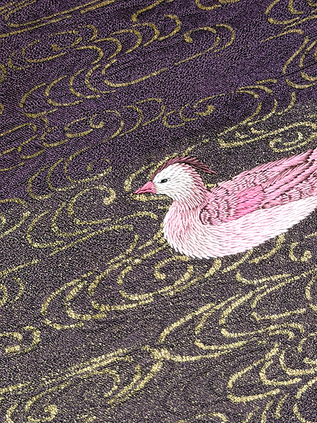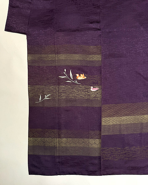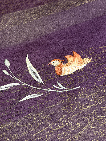 紫根色の地に全体に地紋の観世水文様を施し、裾には刺繍の鴛鴦が仲良く泳いでいます。