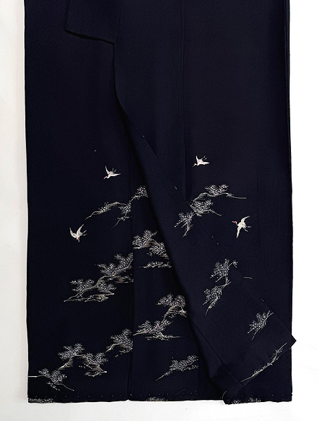 江戸期のミニマリズムを引き継いだ裾の小さな文様は、染めの上にかわいいピンクのお花が刺繍です。