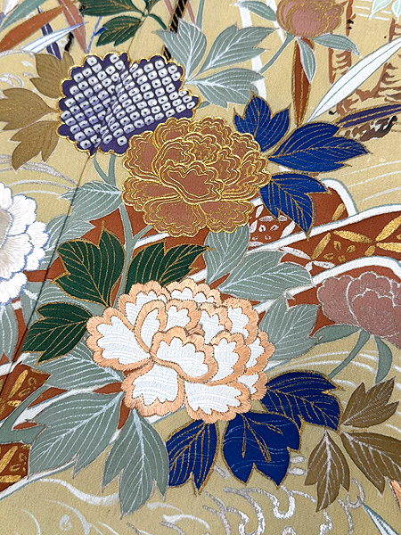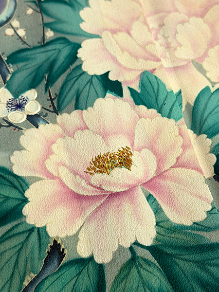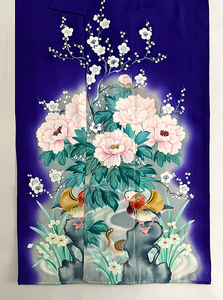 きれいな地色に牡丹と梅、水仙の花が明るく春を告げています。
