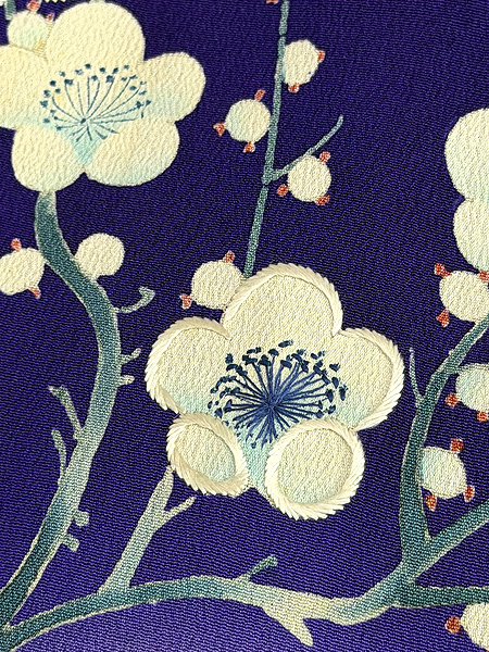 槍梅と橘が裾から肩まで突き抜けて、縁起の良い、元気が湧き出てくるような着物はいかがでしょうか。