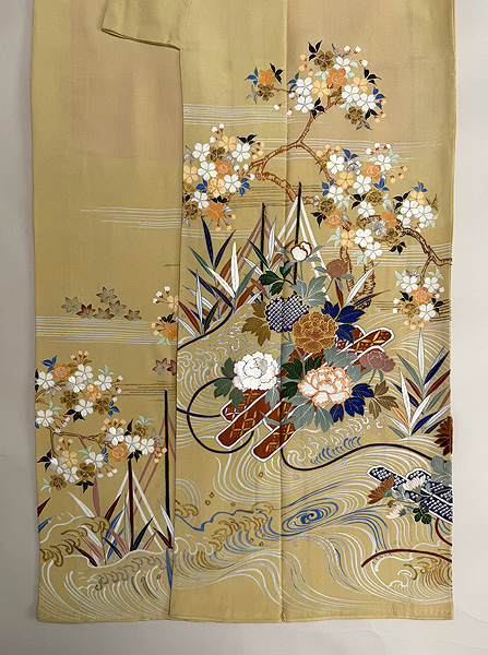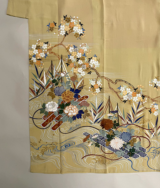 裾を取り巻く川辺には、千々にお花が咲き乱れて、御所に向かう花筏も浮かべられています。