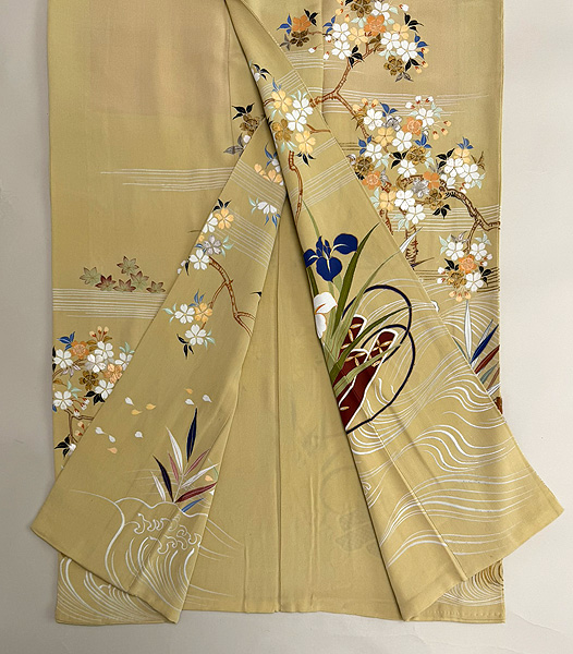 裾に石畳文様が絞りで表現されていますが、四角の石は白く残り、鹿子絞りの所は地色の柳色が見えて、紗綾型の地紋の妙味が美しく生かされた付下となっています。