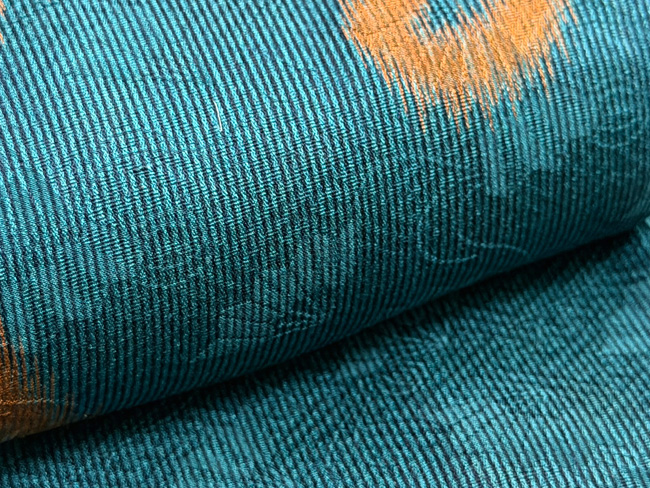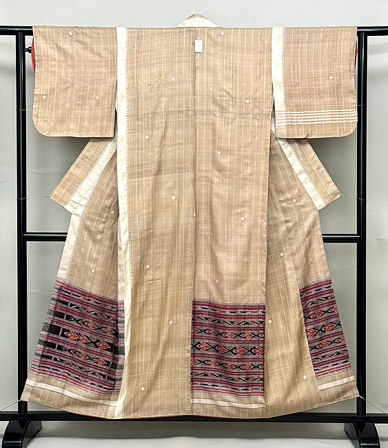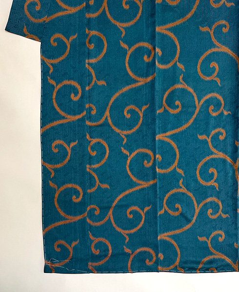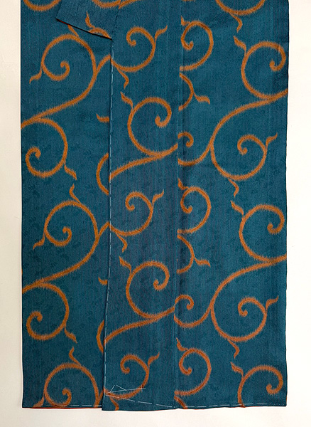 錦紗の変わり織で、細い黒い線に扇面の地紋が浮き出て、唐草のかすり足と共に着物の柄に深みを出しています。