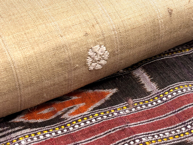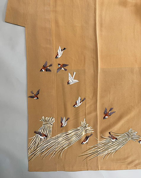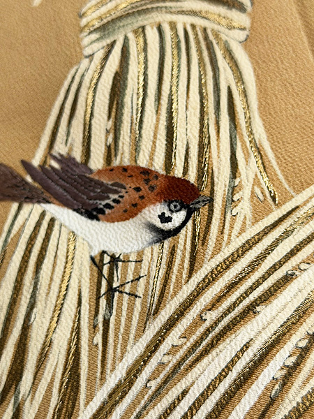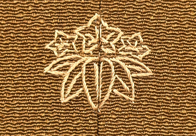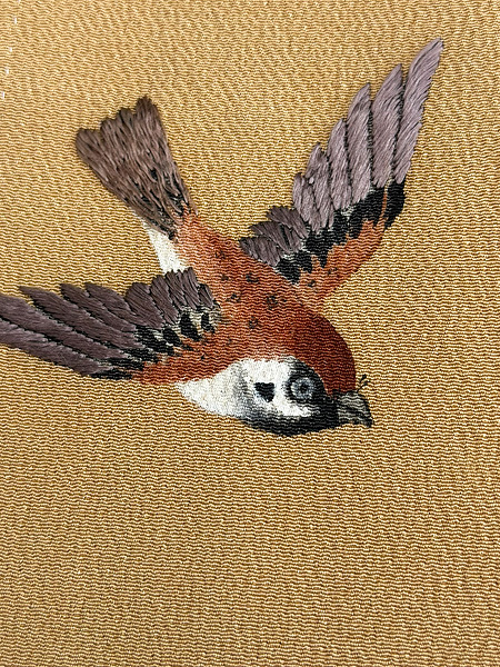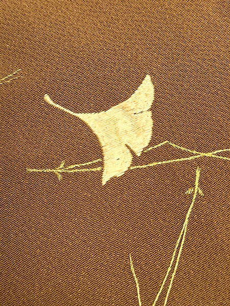 薄物に金箔糸で隙間を作って縫って行く刺繍は、優雅で立体感があり、格調を伴います。