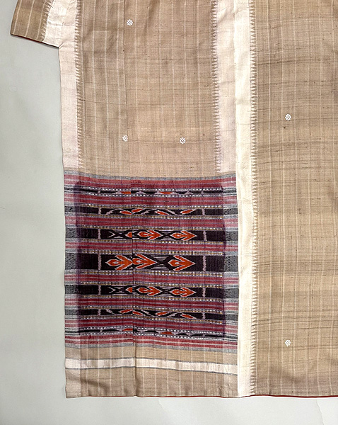 ベージュのタッサーシルク地に格子と花の紋織を散らし、裾に素敵な絣を配した品良い付下です。一つ紋付き。