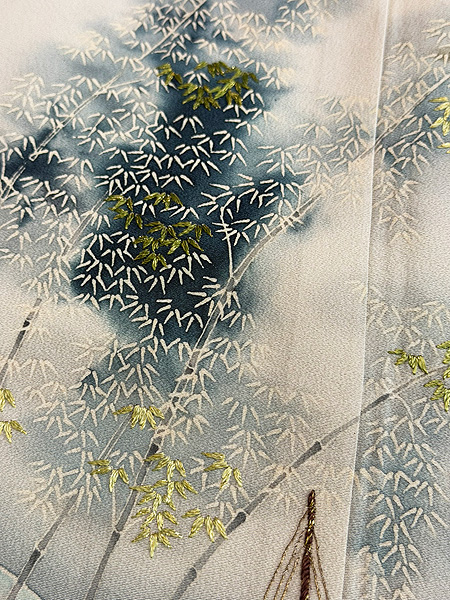 裾の吹き寄せ文様と笹竜胆の一つ紋とが、みごとな刺繍で表現されています。