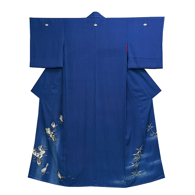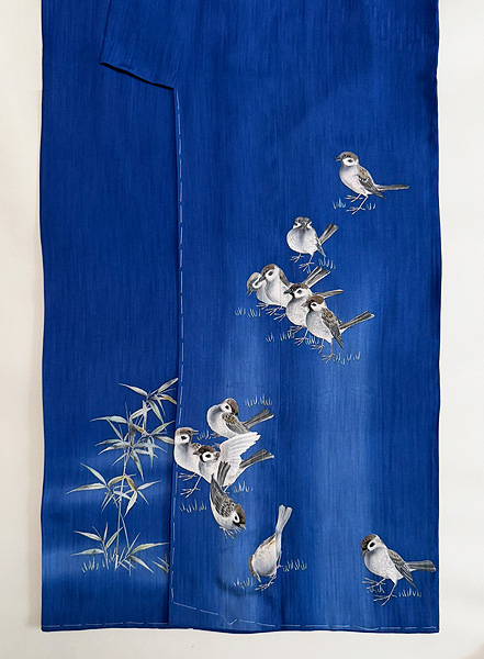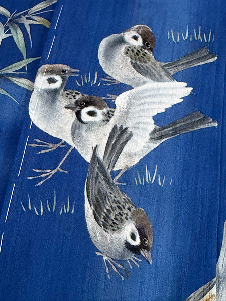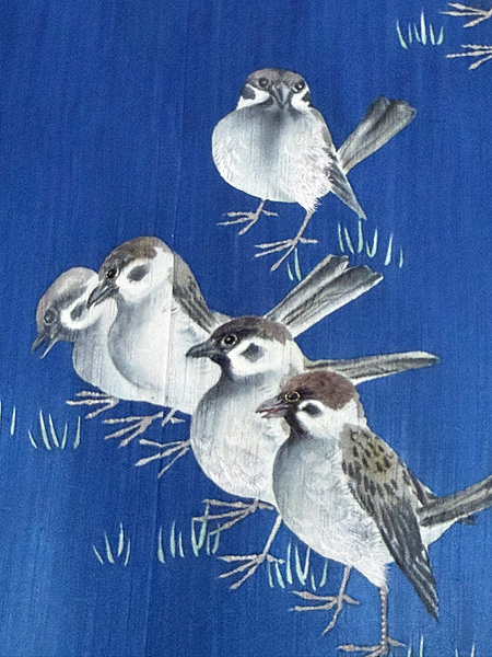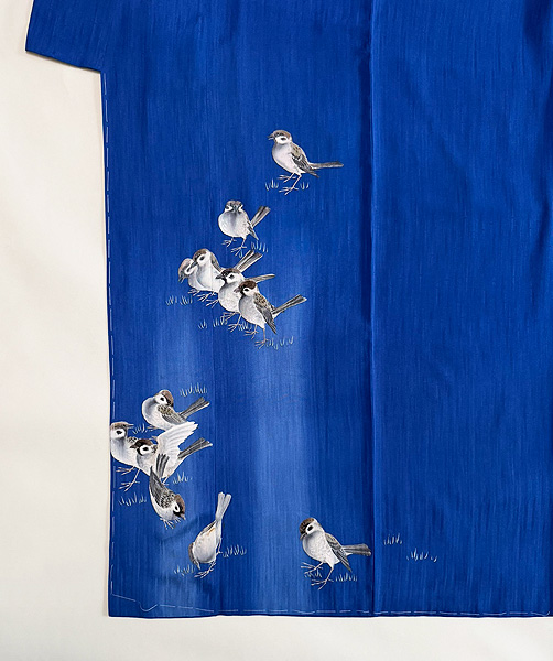 縦筋の地紋が雨のようにも見える瑠璃色の生地に、可愛らしい雀を描いた付下です。