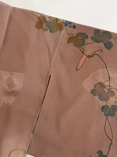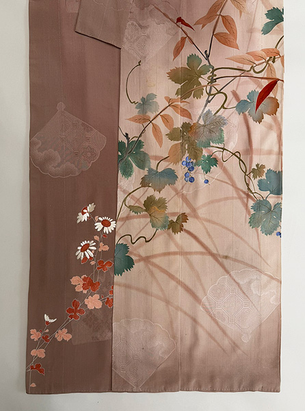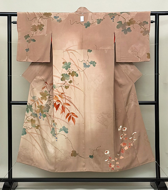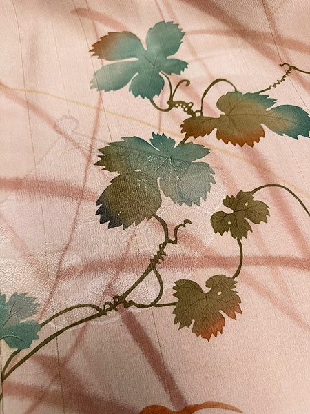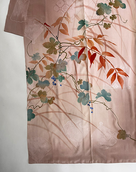 裾から背、肩、袖へと流れるように描かれた山ぶどうの蔓と実が、ダイナミックで生命力に溢れています。